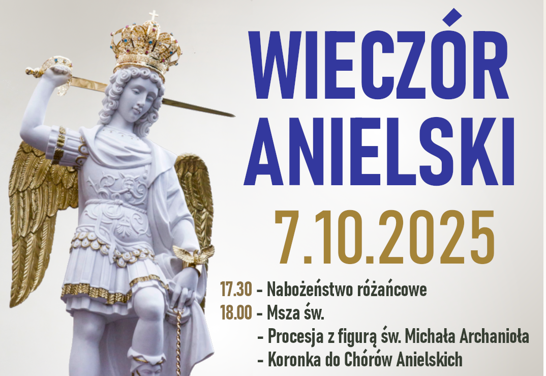 W dniu 7 października tj. wtorek zapraszamy na Wieczór Anielski. 17.30 – Nabożeństwo różańcowe, 18.00 – Msza św., po Mszy św. procesja z figurą św. Michała Archanioła wokół kościoła i modlitwa Koronką do Chórów Anielskich.