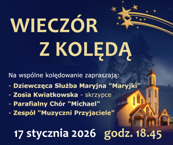 Zapraszamy na „WIECZÓR Z KOLĘDĄ”, który odbędzie się 17 stycznia 2026, godz. 18.45 (bezpośrednio po Mszy św.). Podczas koncertu zabrzmią najpiękniejsze Polskie Kolędy i Pastorałki w wykonaniu dzieci, młodzieży i dorosłych. Na wspólne kolędowanie zapraszają: • Dziewczęca Służba Maryjna „Maryjki” • Zosia Kwiatkowska – skrzypce • Parafialny Chór „Michael” • […]