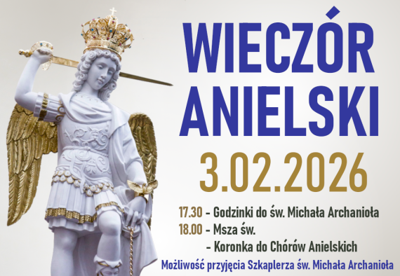 W dniu 3 lutego br. tj. wtorek zapraszamy na Wieczór Anielski. 17.30 – Godzinki do św. Michała Archanioła, 18.00 – Msza św., po Mszy św. Koronka do Chórów Anielskich Będzie możliwość przyjęcia Szkaplerza św. Michała Archanioła. Zainteresowanych prosimy o zgłoszenie się przed Mszą św. w recepcji przy wejściu do kościoła.