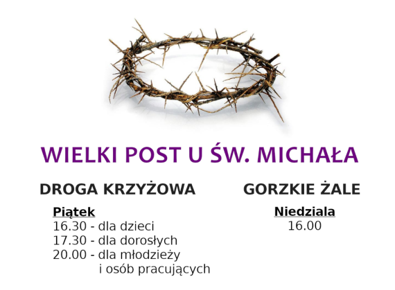 DROGA KRZYŻOWA o godz. 17:30 prowadzą: 20.02 – KWC 27.02 – Akcja Katolicka 06.03 – Rycerstwo św. Michała 13.03 – Chór „Michael” 20.03 – Rodzina RM 27.03 – Domowy Kościół GORZKIE ŻALE – ADORACJE RÓŻ 22.02 – św. Anny Prorokini, MB Anielskiej, MB Bolesnej, św. Józefa Sebastiana Pelczara 01.03 – […]