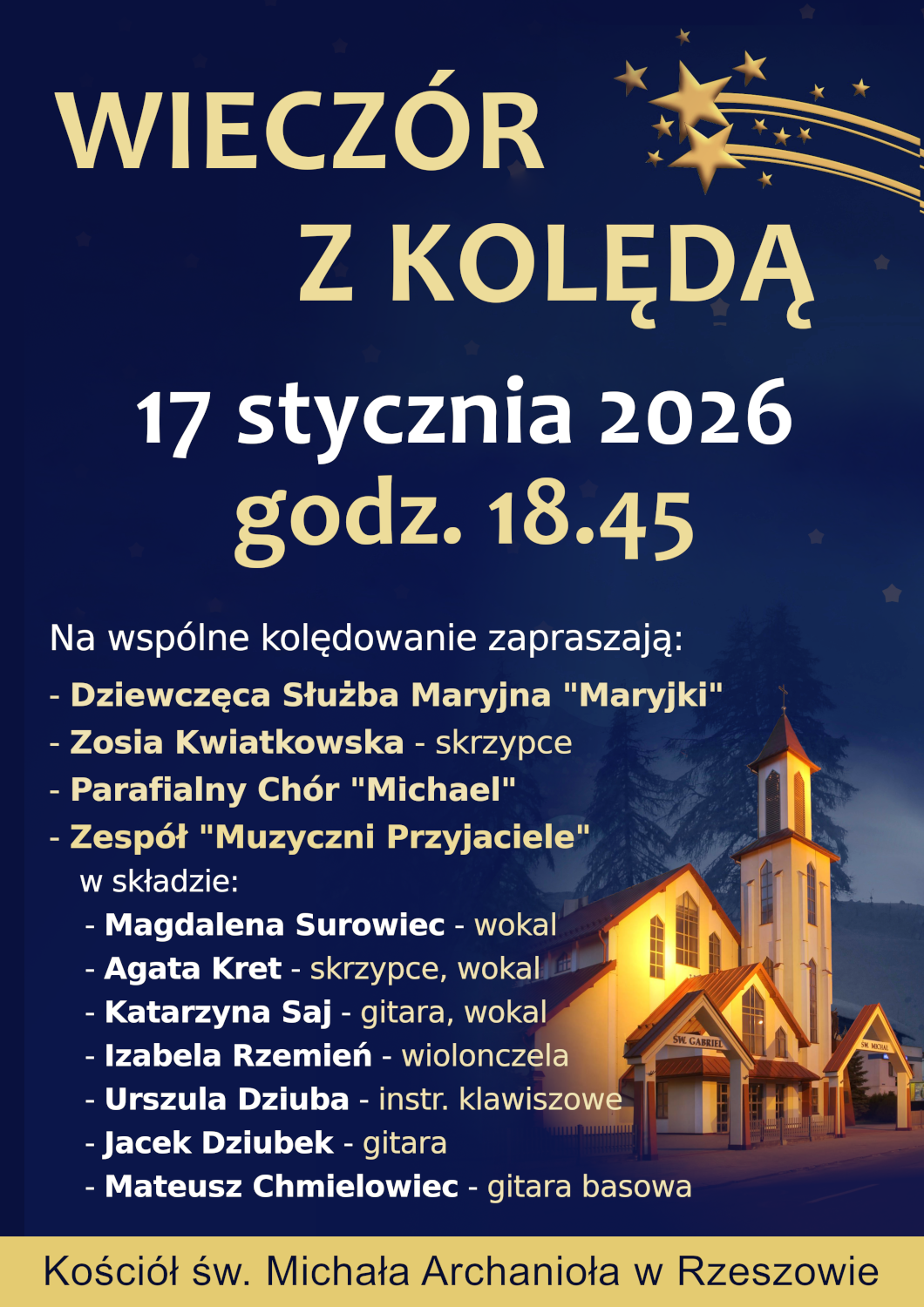 Zapraszamy na „WIECZÓR Z KOLĘDĄ”, który odbędzie się 17 stycznia 2026, godz. 18.45 (bezpośrednio po Mszy św.).